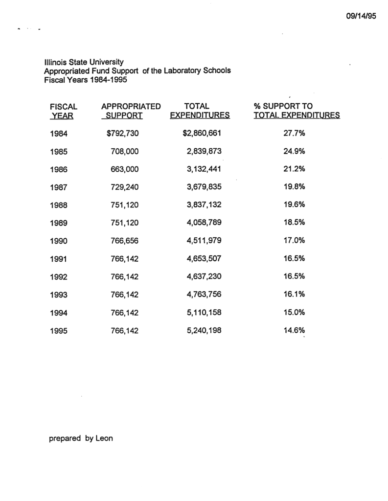 According to a 1995 memo from the College of Education, in 1984 Illinois State University allocated $792,730 to the Lab Schools — enough to cover 27.7% of their operating expenses.